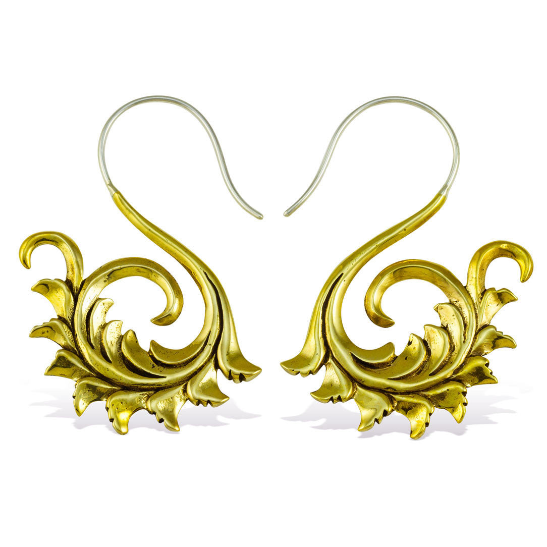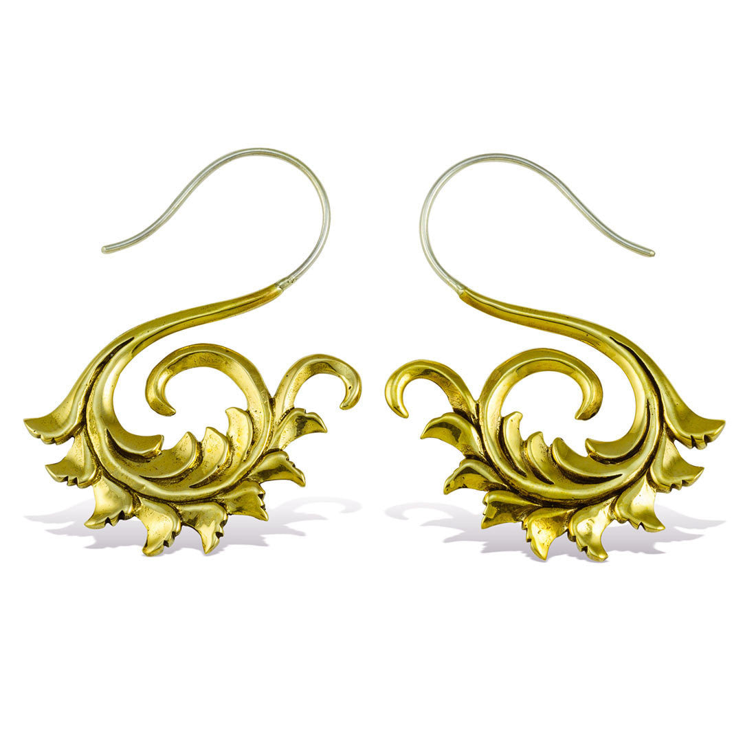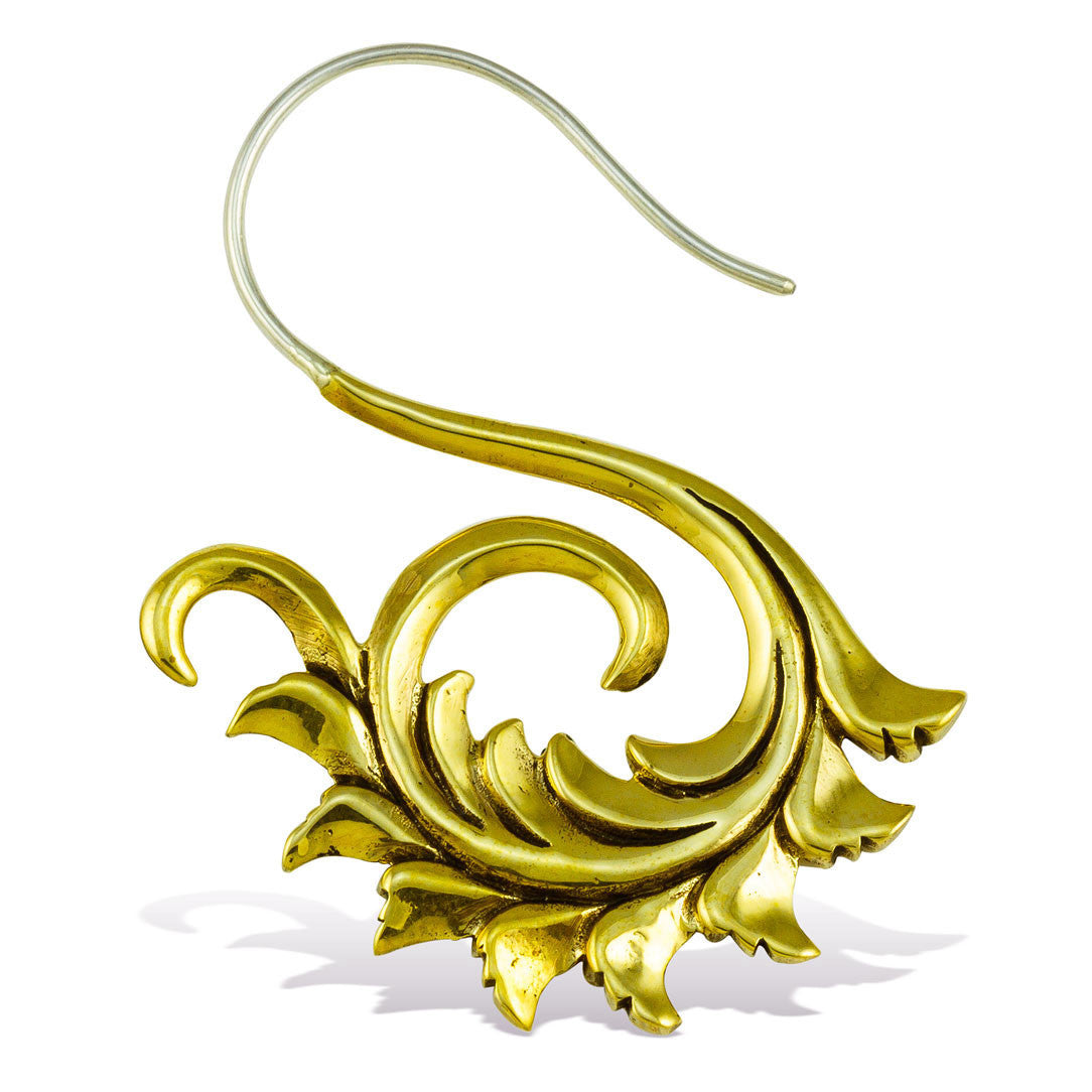 These handmade brass earrings are shaped into designs that are inspired by nature and Hindu culture. The 18 gauge sterling silver posts fit standard sized pierced ears.