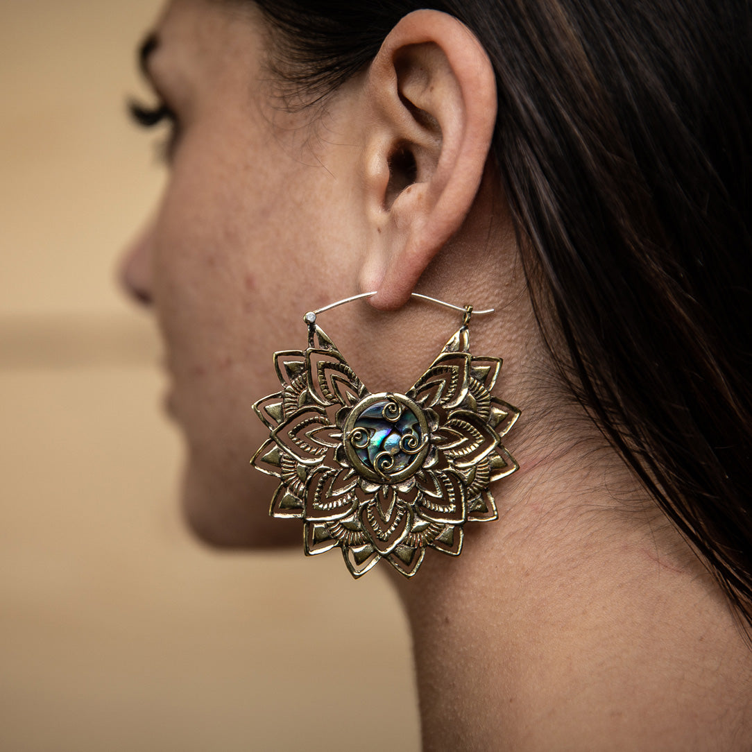 These handmade brass earrings are shaped into designs that are inspired by nature and mythology. Due to the natural characteristics of the abalone shell from New Zealand, some variations in color may occur. The 18 gauge sterling silver posts fit standard sized pierced ears.