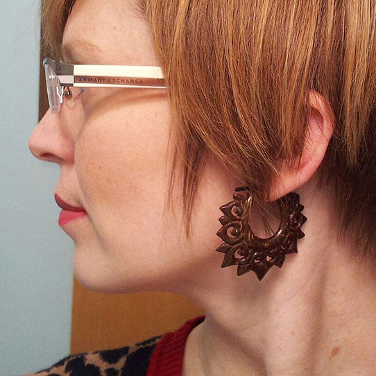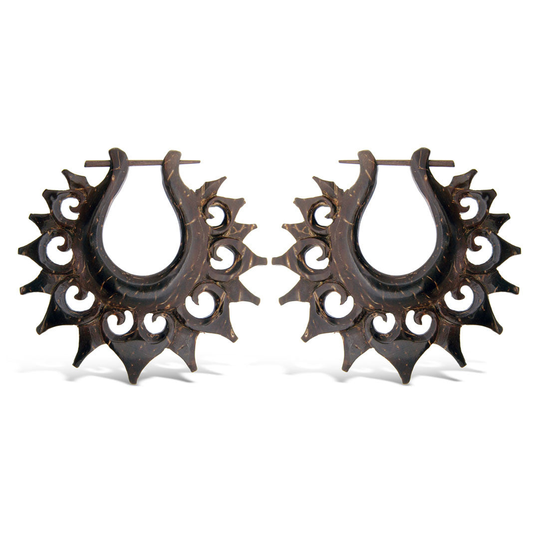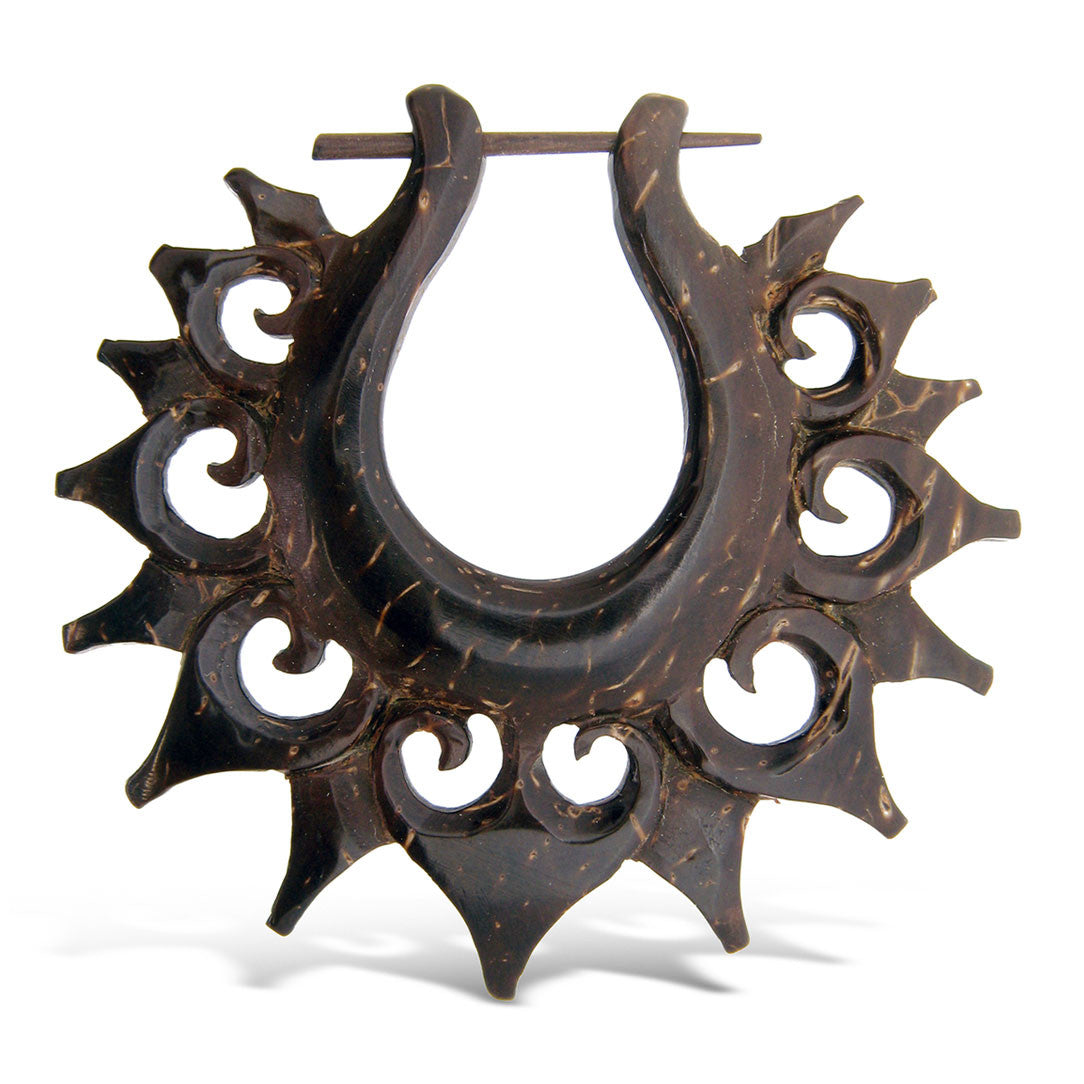 The coconuts and palm nuts used to carve these earrings are acquired from local farmers in Central and South America. The various pigmentation on these coconut earrings are the natural color tones found on the coconut shell. The post fits a standard size piercing, rarely causes irritation, and is a great alternative for people who are sensitive to metallic earrings.