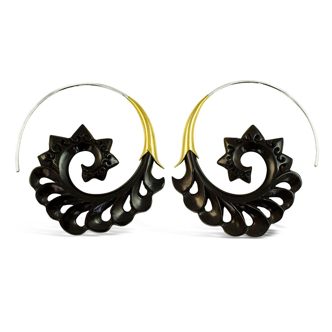 Inlaid in brass, these earrings are carved from salvaged horn from a domesticated water buffalo used for cultivation and food. The 18 gauge sterling silver posts fit standard sized pierced ears.