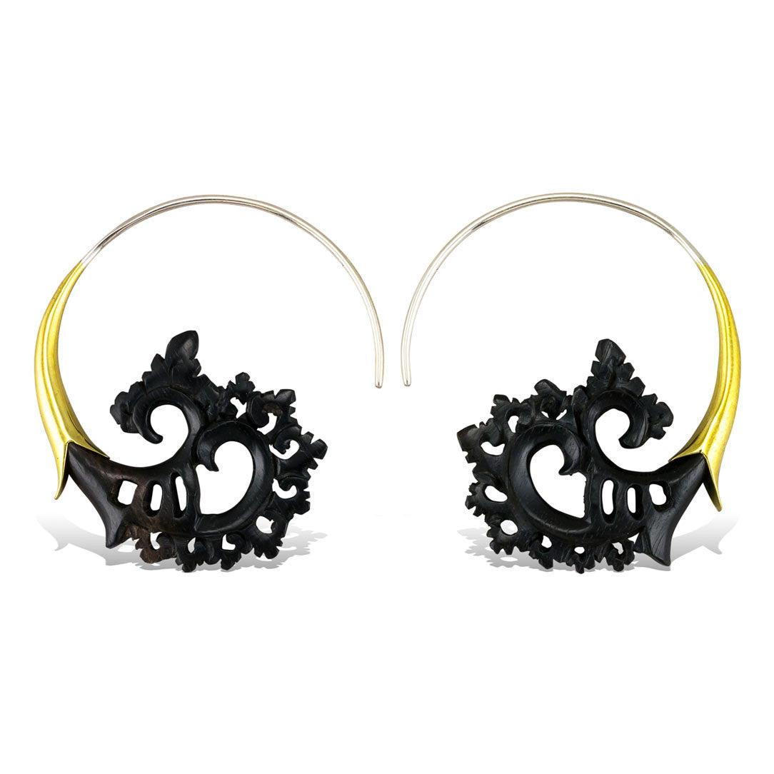 Inlaid in brass, these earrings are carved from tropical hardwoods. Due to the natural characteristics of the wood, some variations in color may occur. The 18 gauge sterling silver posts fit standard sized pierced ears.