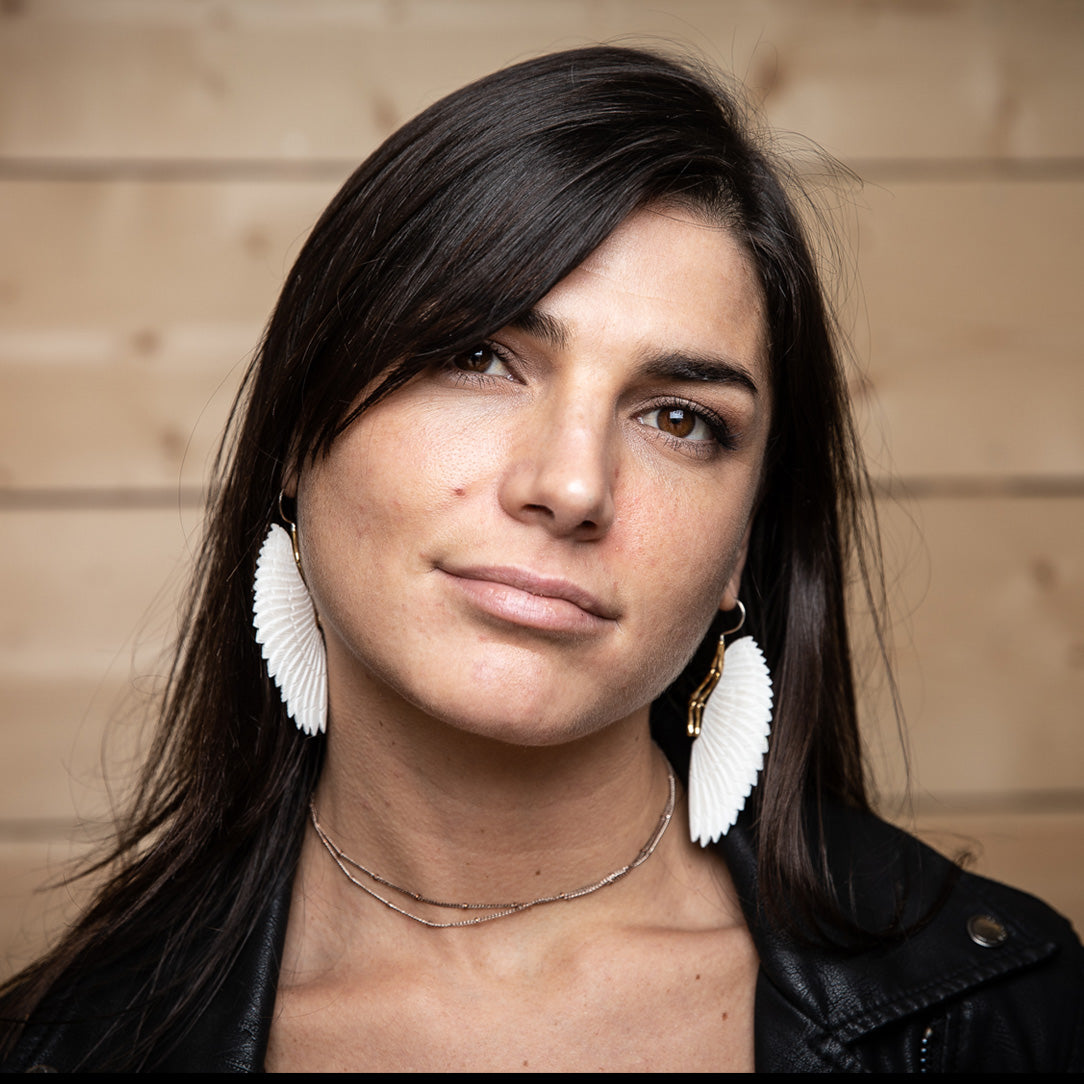 Inlaid in brass, these earrings are carved from salvaged bone from a domesticated water buffalo used for cultivation and food. The 18 gauge sterling silver posts fit standard sized pierced ears.