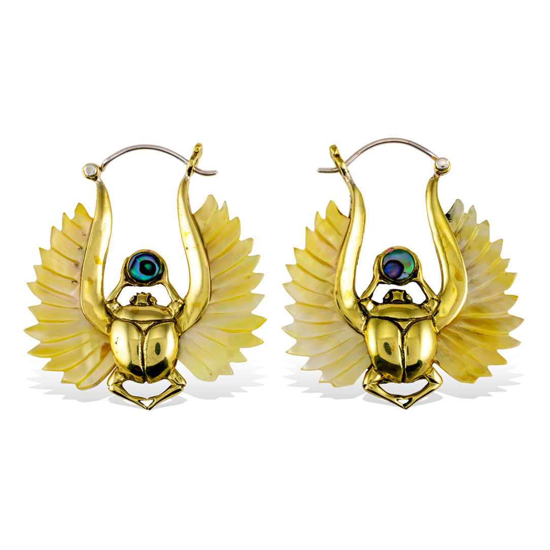 Inlaid in brass, these earrings are hand carved from shell originating from New Zealand. Due to the natural characteristics of the shell some variations in color may occur. The 18 gauge sterling silver posts fit standard sized pierced ears.