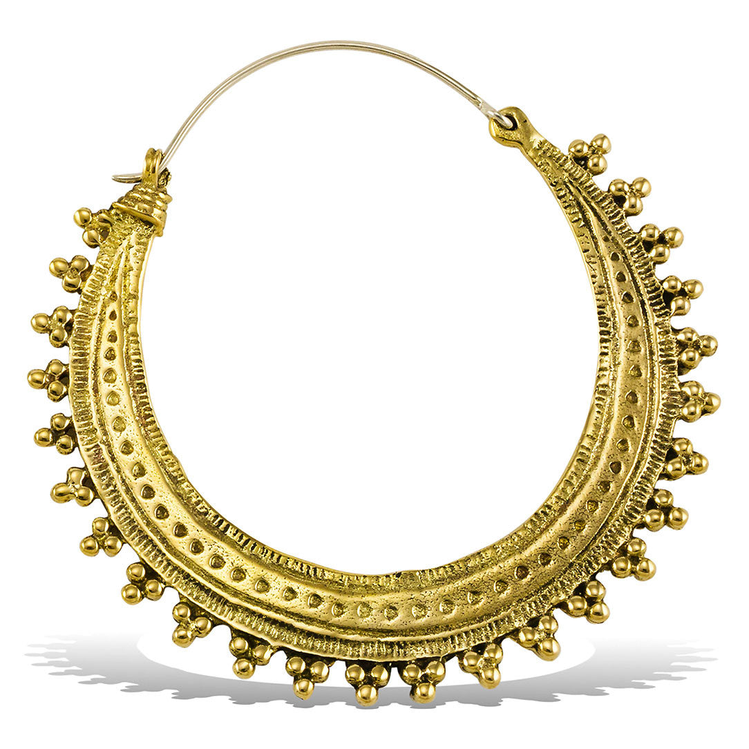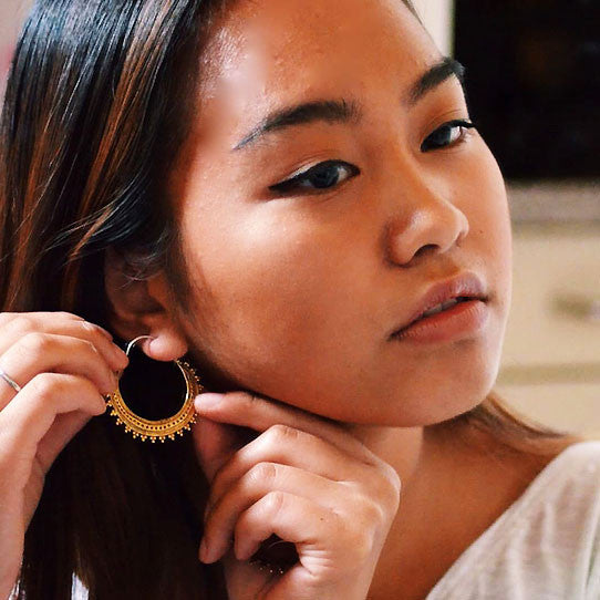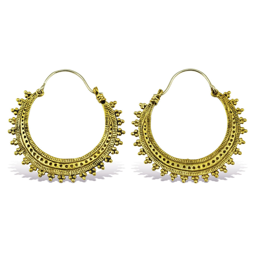 These handmade brass earrings are shaped into designs that are inspired by nature and Hindu culture. The 18 gauge sterling silver posts fit standard sized pierced ears.