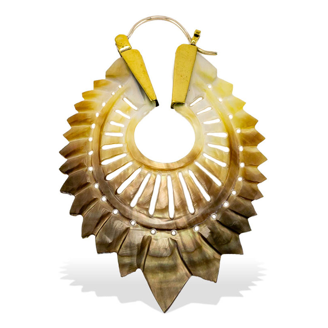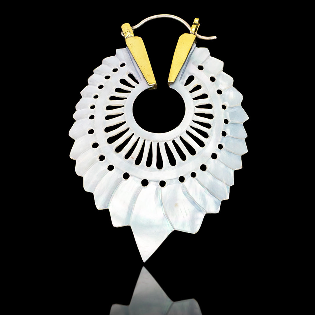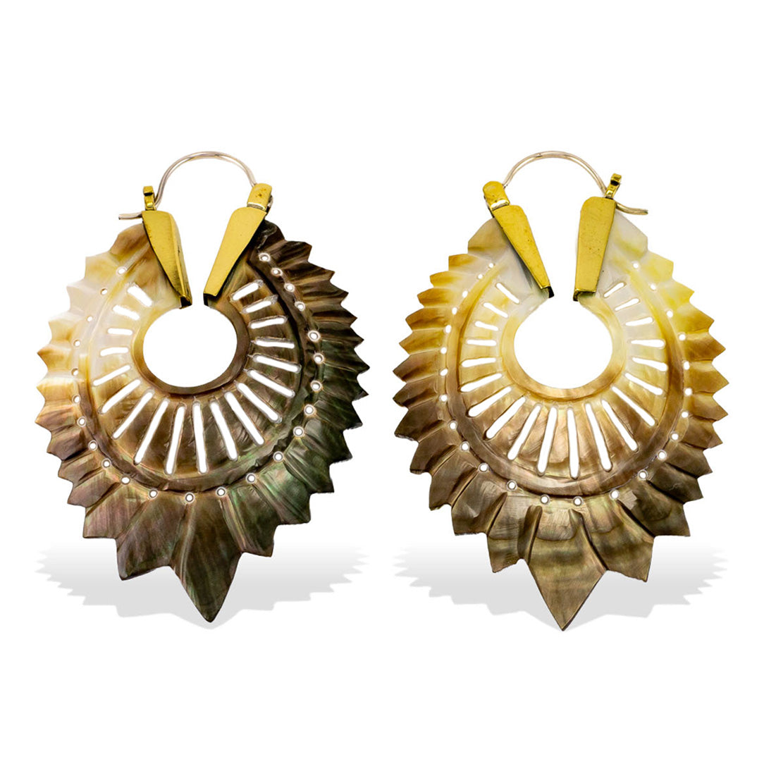 Inlaid in brass, these earrings are hand carved from shell originating from New Zealand. Due to the natural characteristics of the shell some variations in color may occur. The 18 gauge sterling silver posts fit standard sized pierced ears.