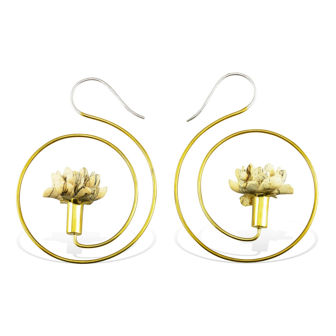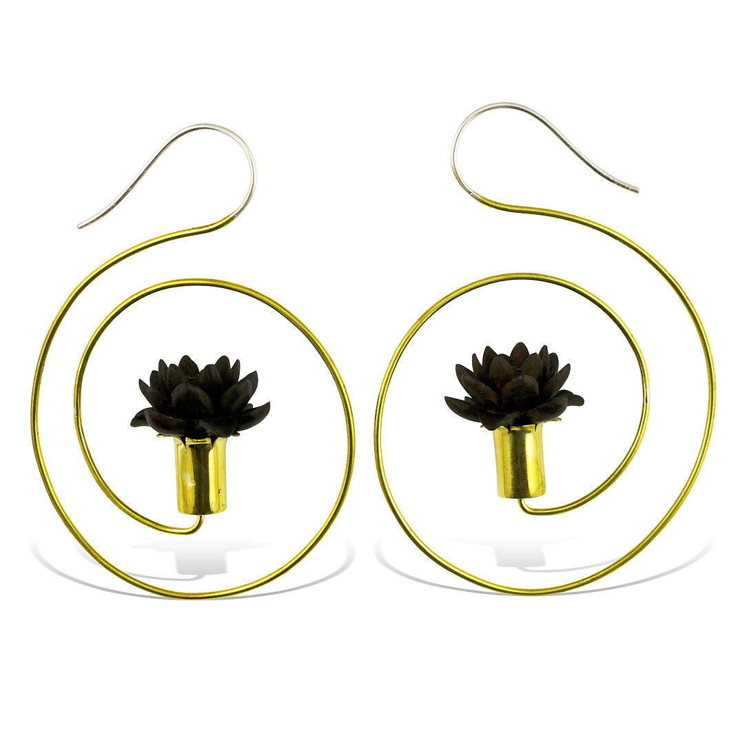 Inlaid in brass, these earrings are carved from tropical hardwoods. Due to the natural characteristics of the wood, some variations in color may occur. The 18 gauge sterling silver posts fit standard sized pierced ears.