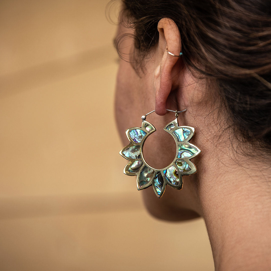 These handmade brass earrings are shaped into designs that are inspired by nature and mythology. Due to the natural characteristics of the abalone shell from New Zealand, some variations in color may occur. The 18 gauge sterling silver posts fit standard sized pierced ears.