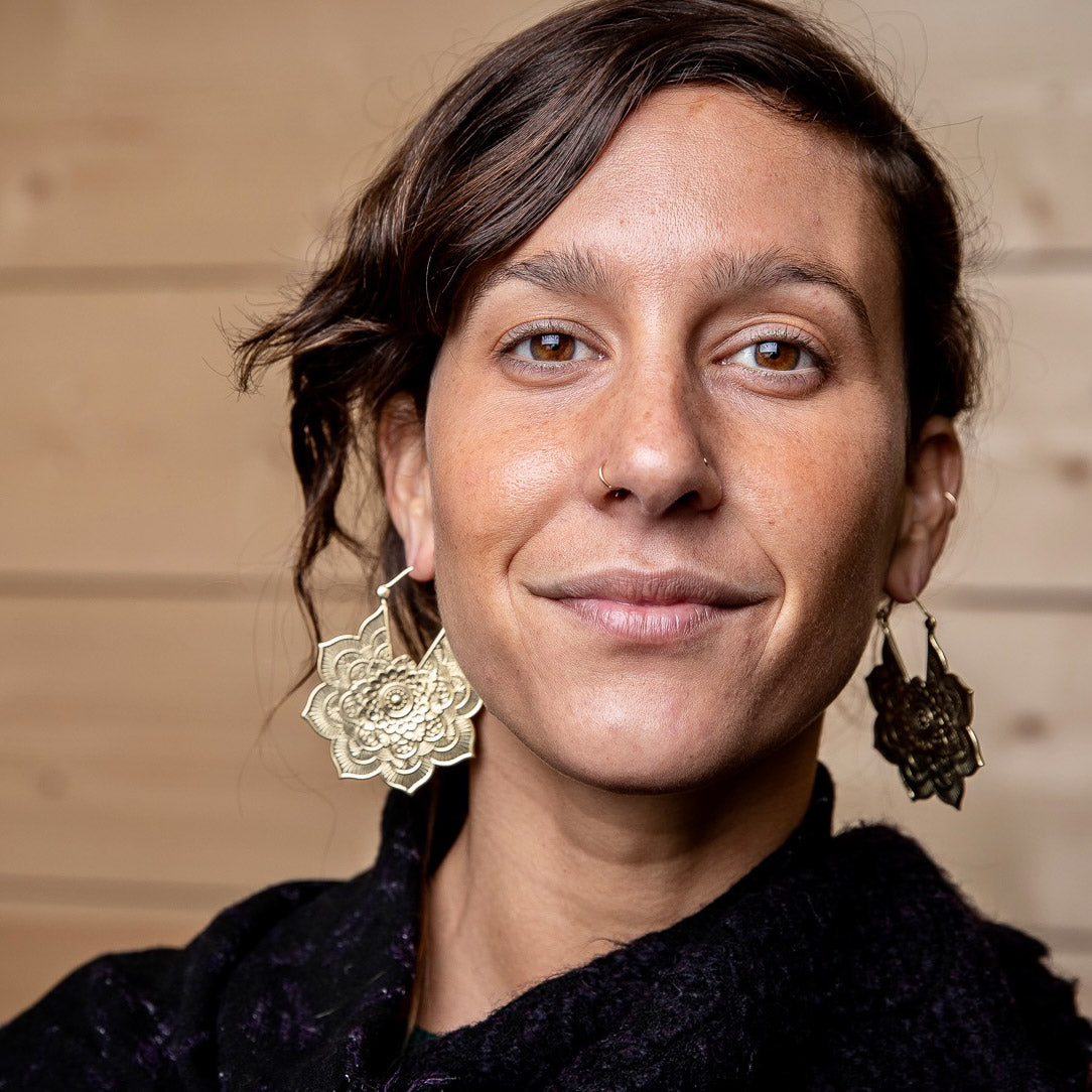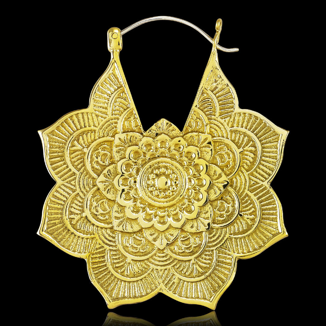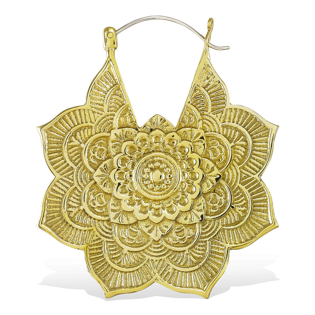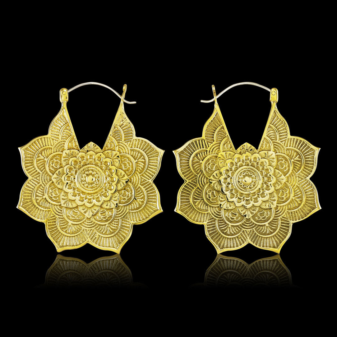 These handmade brass earrings are shaped into designs that are inspired by nature and Hindu culture. The 18 gauge sterling silver posts fit standard sized pierced ears.