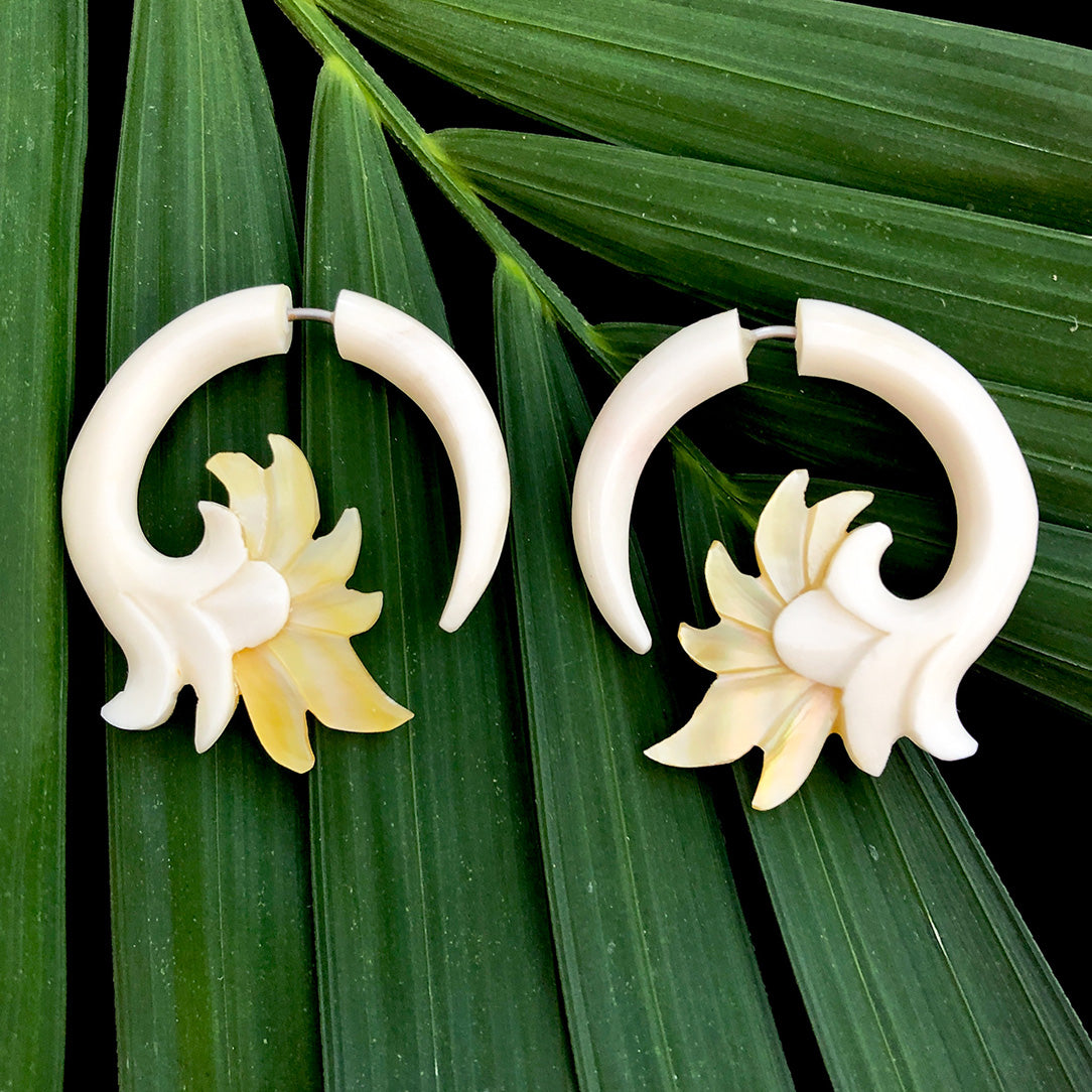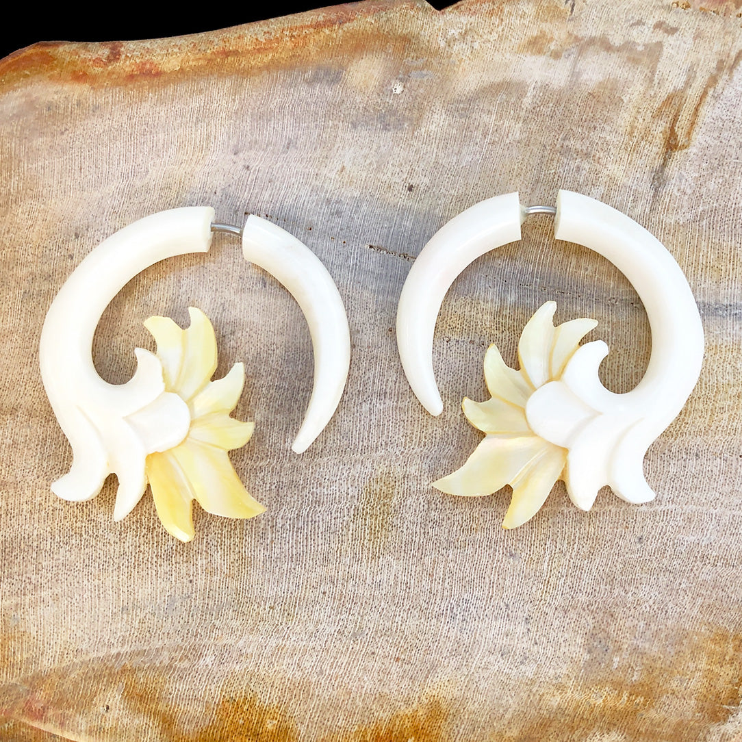 The salvaged bone used for these earrings is from a domesticated water buffalo used for cultivation and food. Due to the natural characteristics of the shell from New Zealand, slight variations in color may occur. The 19 gauge surgical steel post is 100% hypoallergenic.