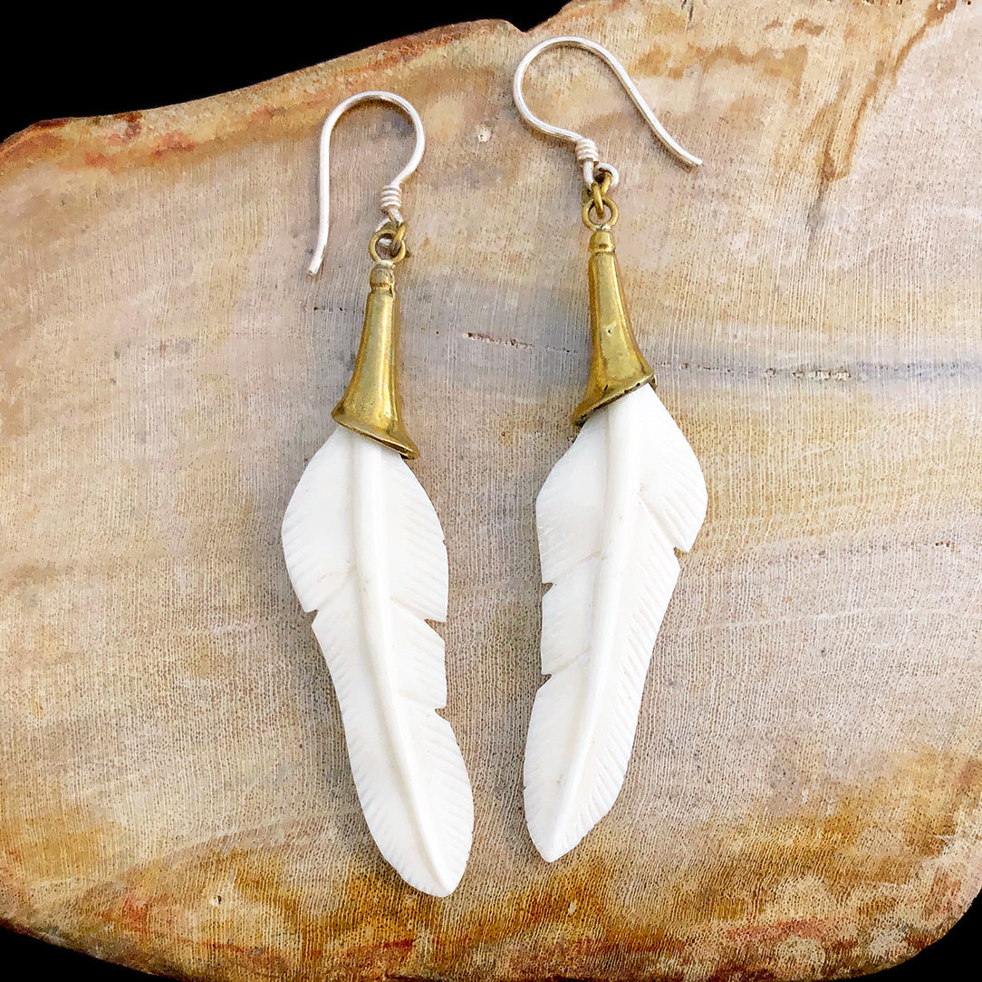 Inlaid in brass, these earrings are carved from salvaged bone from a domesticated water buffalo used for cultivation and food. The 18 gauge sterling silver posts fit standard sized pierced ears.