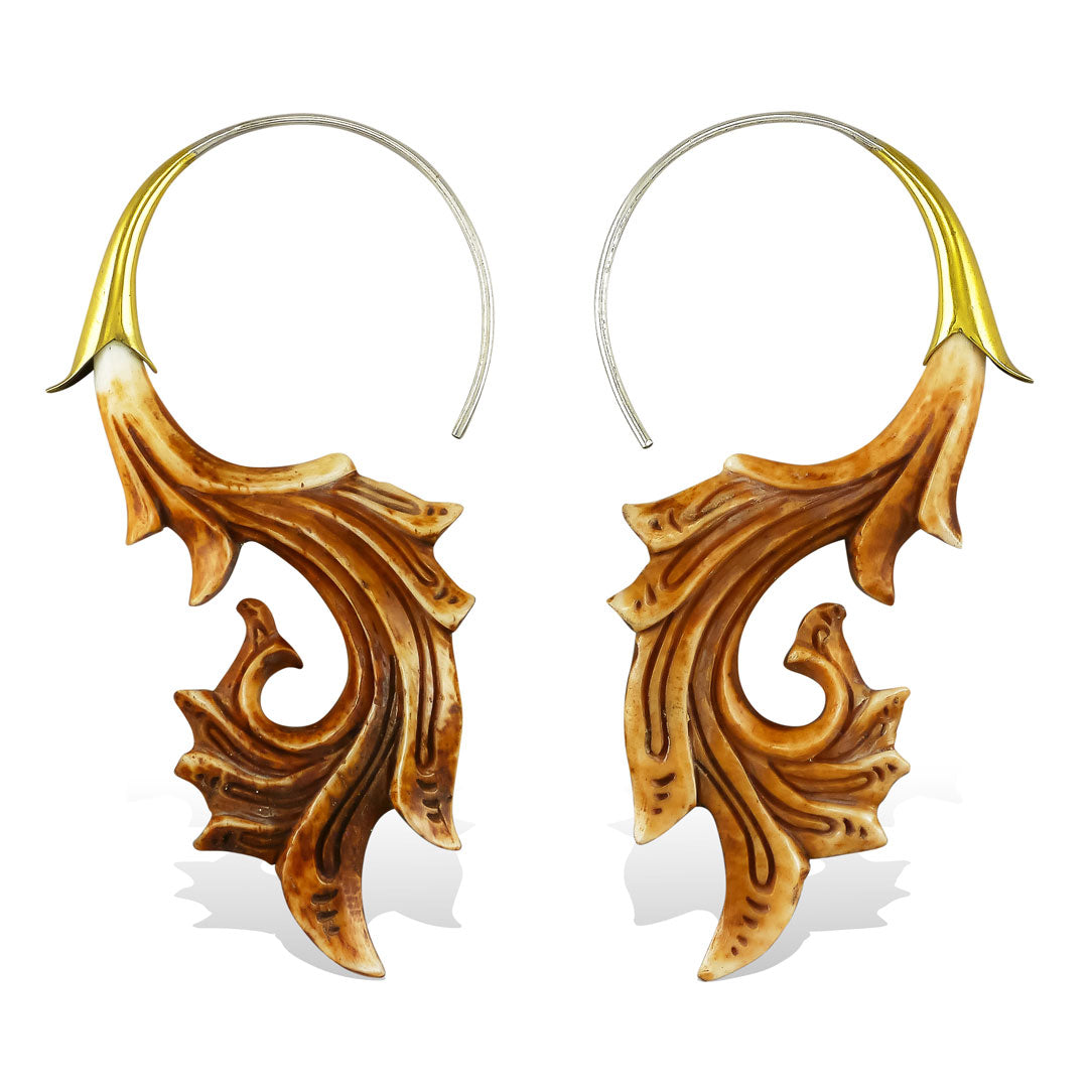 Inlaid in brass, these earrings are carved from salvaged bone from a domesticated water buffalo used for cultivation and food. The 18 gauge sterling silver posts fit standard sized pierced ears.
