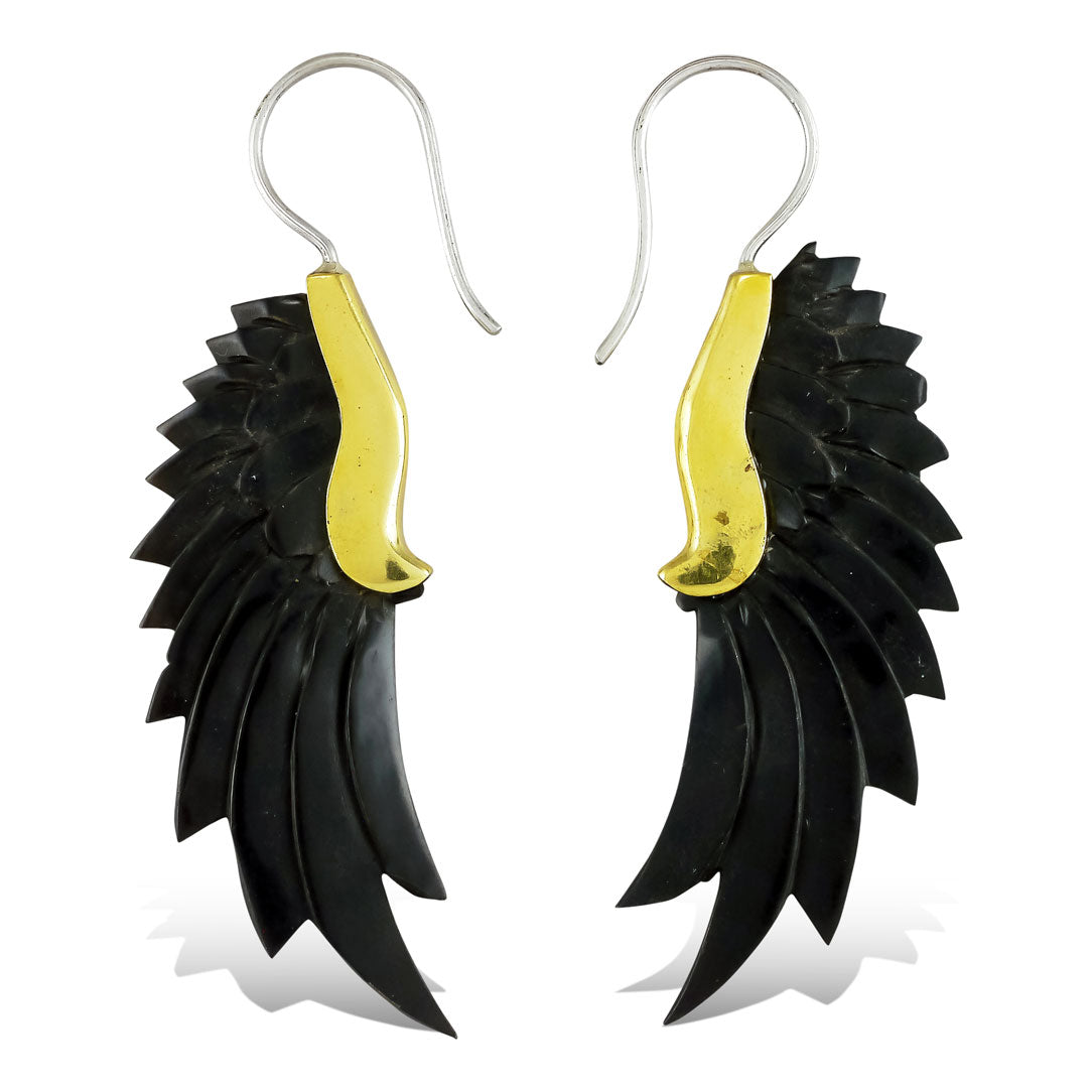 Inlaid in brass, these earrings are carved from salvaged horn from a domesticated water buffalo used for cultivation and food. The 18 gauge sterling silver posts fit standard sized pierced ears.