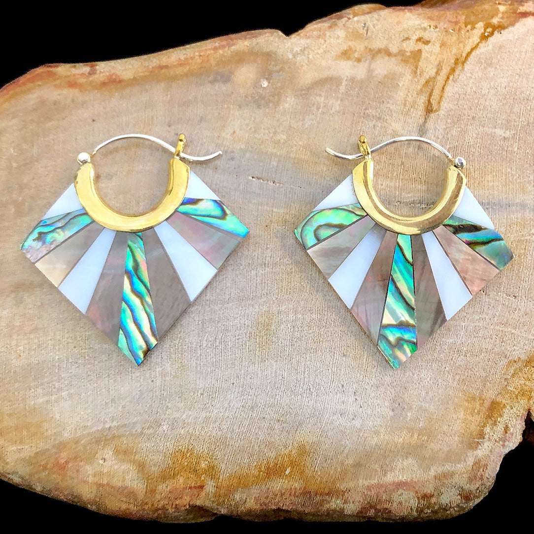 Inlaid in brass, these earrings are hand carved from shell originating from New Zealand. Due to the natural characteristics of the shell some variations in color may occur. The 18 gauge sterling silver posts fit standard sized pierced ears.