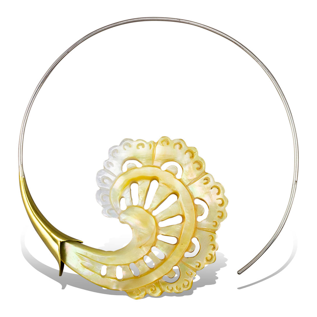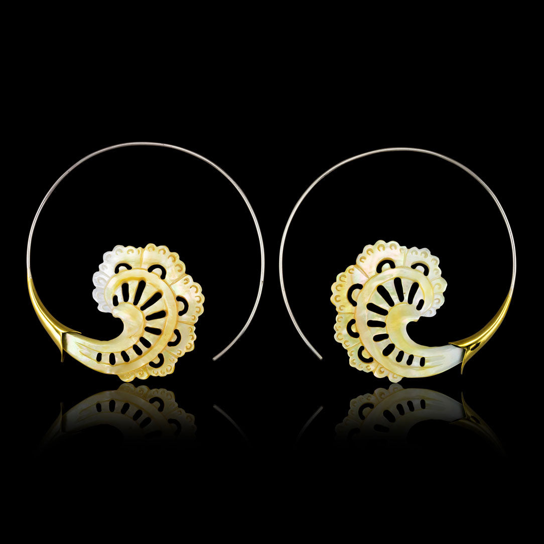 Inlaid in brass, these earrings are hand carved from shell originating from New Zealand. Due to the natural characteristics of the shell some variations in color may occur.  The 18 gauge sterling silver posts fit standard sized pierced ears.