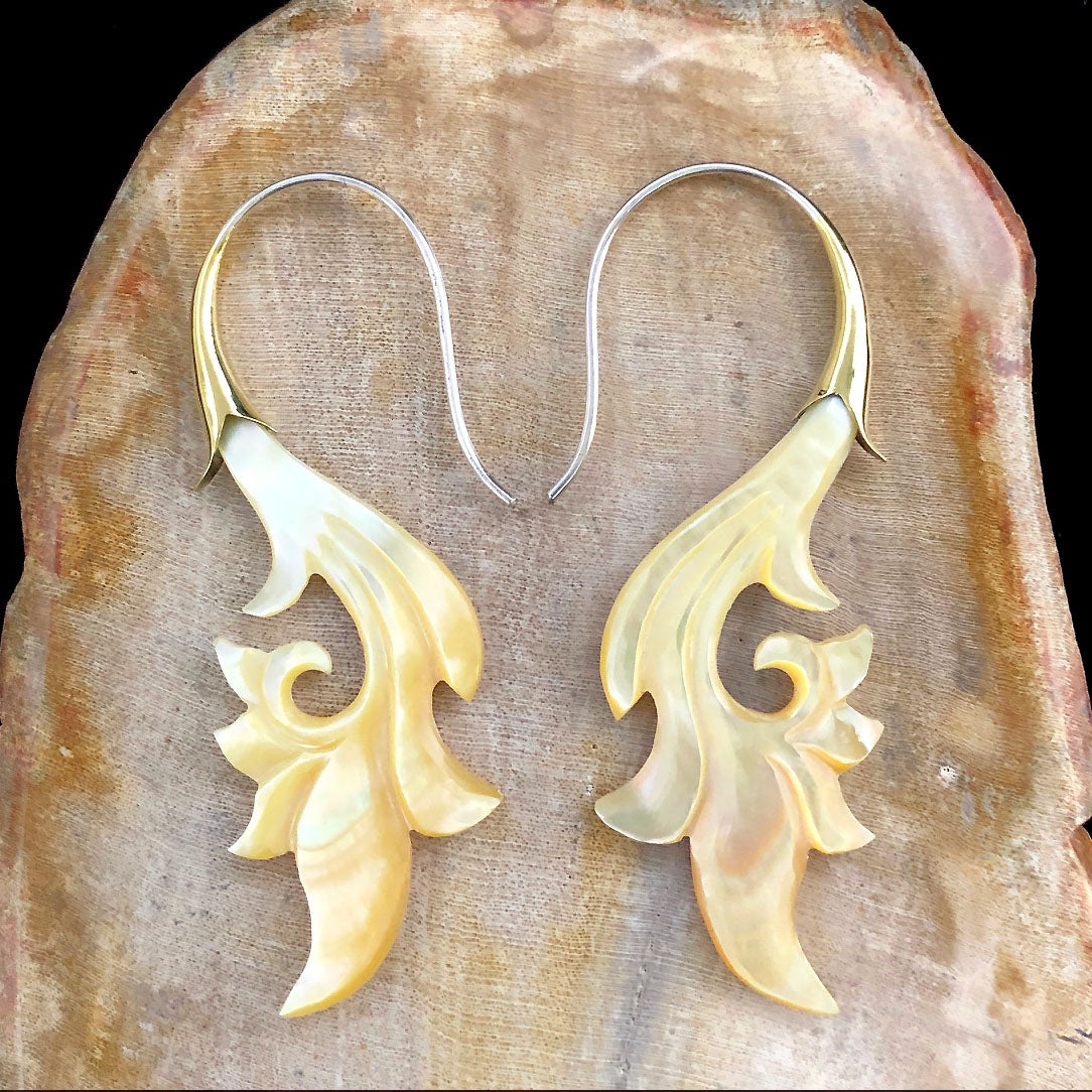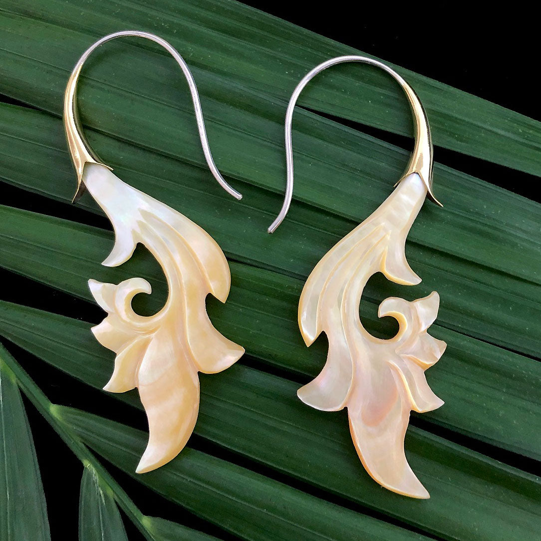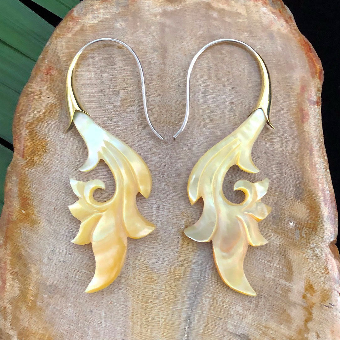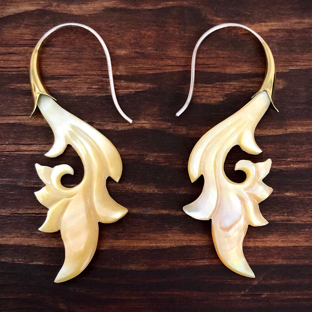 Inlaid in brass, these earrings are hand carved from shell originating from New Zealand. Due to the natural characteristics of the shell some variations in color may occur. The 18 gauge sterling silver posts fit standard sized pierced ears.