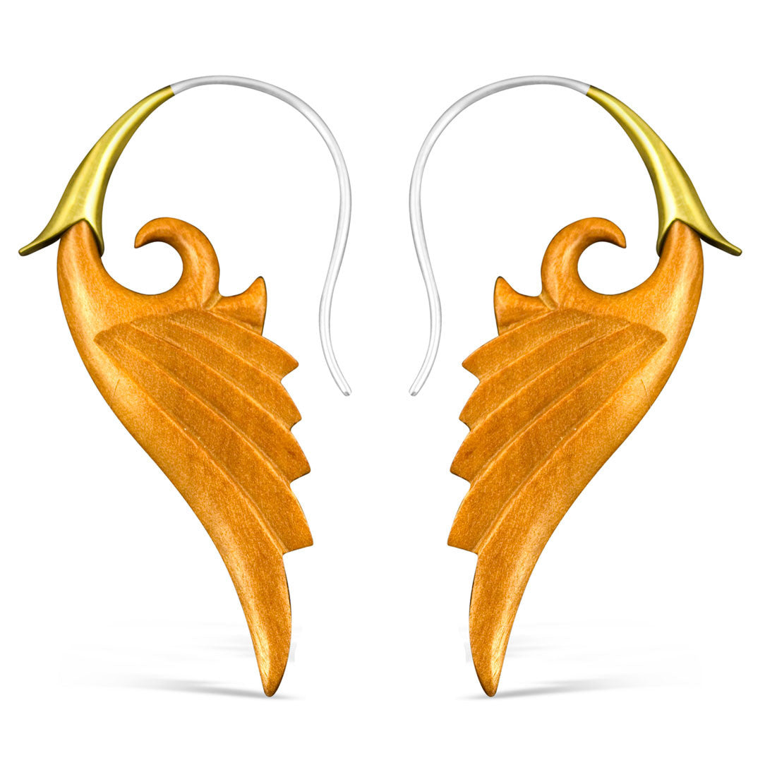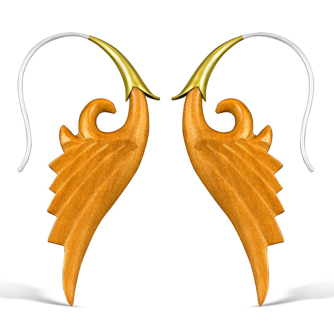 Inlaid in brass, these earrings are carved from tropical hardwoods. Due to the natural characteristics of the wood, some variations in color may occur. The 18 gauge sterling silver posts fit standard sized pierced ears.