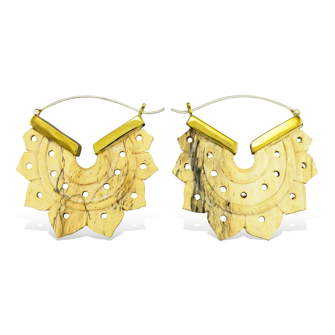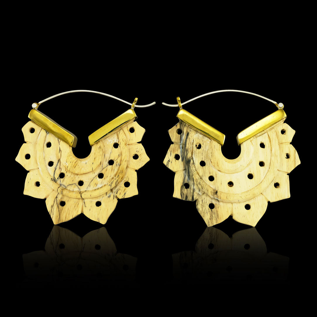 Inlaid in brass, these earrings are carved from tropical hardwoods. Due to the natural characteristics of the wood, some variations in color may occur. The 18 gauge sterling silver posts fit standard sized pierced ears.