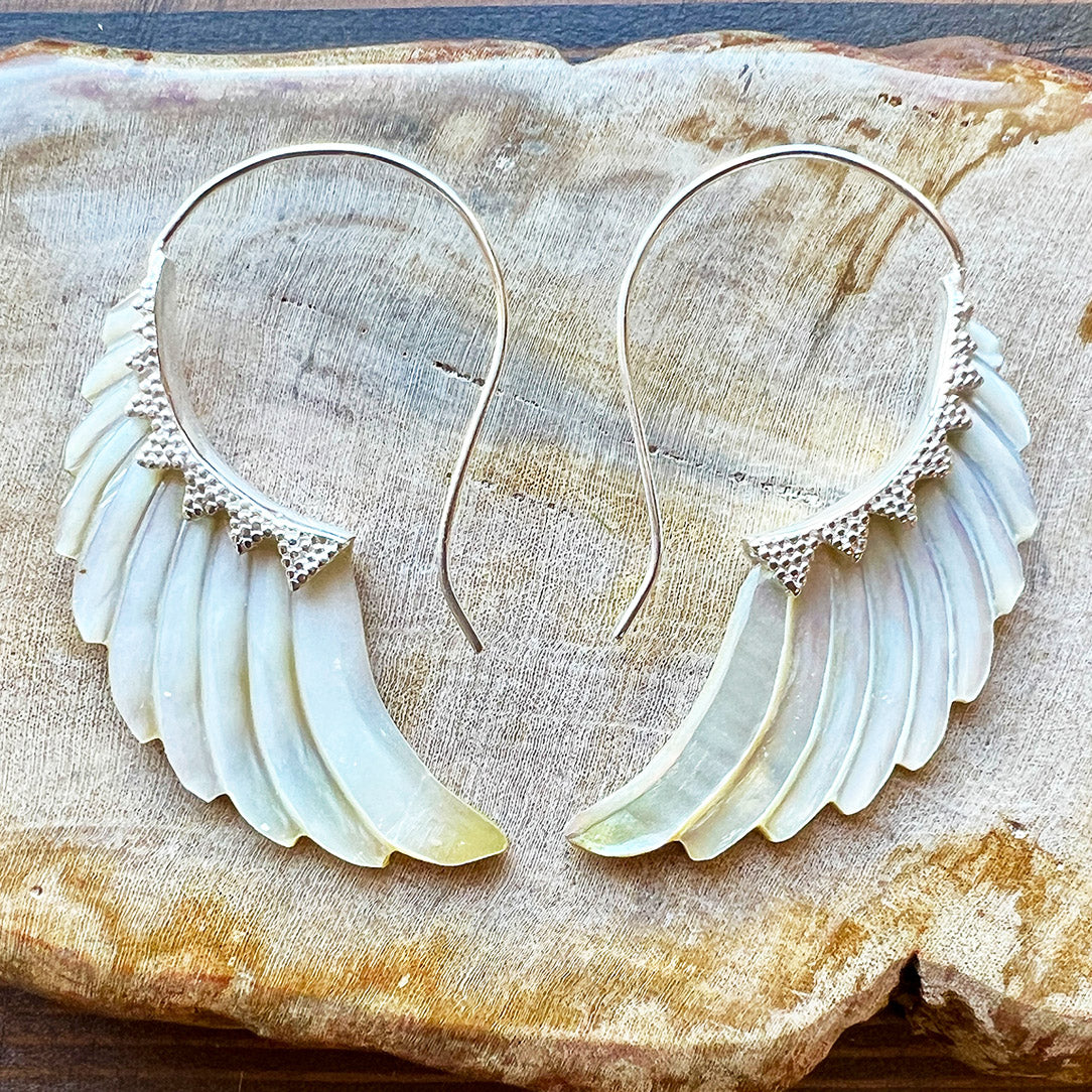 Inlaid in silver plated metal, these earrings are hand carved from shell originating from New Zealand. Due to the natural characteristics of the shell some variations in color may occur.  The 18 gauge sterling silver posts fit standard sized pierced ears and come with earring backings.