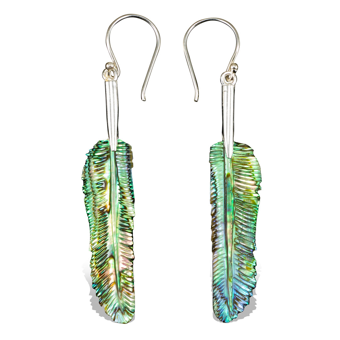 Inlaid in silver plated metal, these earrings are hand carved from abalone shell originating from New Zealand. Due to the natural characteristics of the shell some variations in color may occur. The 18 gauge sterling silver posts fit standard sized pierced ears and come with earring backings.